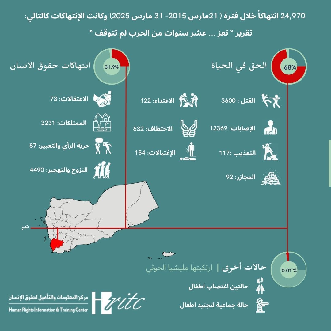 أصدر مركز المعلومات والتأهيل لحقوق الإنسان (HIRTTC ) تقريراً ميدانياً بعنوان “تعز.. عشر سنوات من حرب لا تتوقف”، وثّق فيه 24,970 انتهاكاً طال المدنيين والممتلكات في محافظة تعز خلال عشرة أعوام من الحرب منذ اجتياح مليشيا الحوثي للمحافظة في 21 مارس 2015 وحتى 31 مارس 2025.